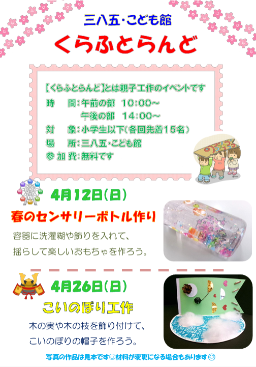 三八五・こども館 くらふとらんど こいのぼり工作 Calendar いつ: 2026年4月26日 @ 10:00 – 14:002026-04-26T10:00:00+09:002026-04-26T14:00:00+09:00どこで: 三八五・こども館料金: 無料連絡先: 三八五流通営業本部 指定管理 八戸公園課 0178-96-2932 イベント【日時】4/26(日)午前の部10:00~12:00(受付開始9:00) 午後の部14:00~16:00(受付開始13:00)【対象】小学生以下(各回15名)【内容】木の実や木の枝を飾り付けて、こいのぼりの帽子を作ろう!詳しくはこちら