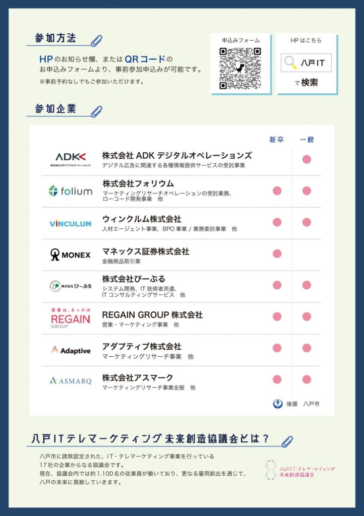 八戸市内のIT・テレマーケティング関連企業と八戸市、青森県で構成される「八戸IT・テレマーケティング未来創造協議会」では、3月26日(木曜日)に「八戸IT企業しごと発見フェア 2026 Spring」を開催します!